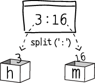 input().split(':') 과 같이 실행하면, 콜론(:) 기호를 기준으로 분리해서 값들을 저장한다.