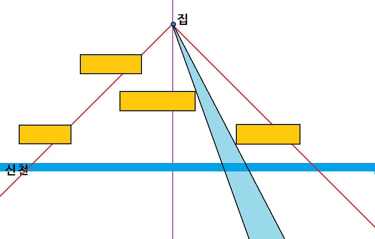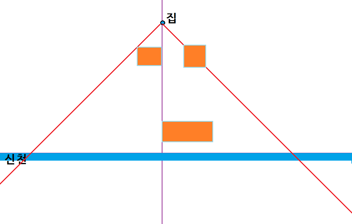 순찬이는 귀찮음 대마왕이었기 때문에, 집을 직접 보러가기 전에 집에서 신천이 볼 수 있는지 알고 싶었다. 그래서 좌표평면을 이용하여 상황을 단순화시켜서 집에서 신천을 볼 수 있는지 알아보기로 하였다.
